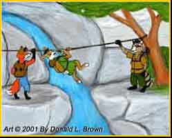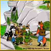 Sidney looks at the raccoon, and says. "We might have better luck higher up." Tim looks upstream, and agrees. The stream cuts through a narrow gap about 250 meters up the mountain. The rain stops as the fox takes the lead with the others close behind.