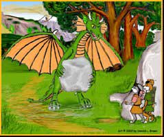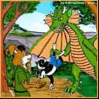 As Mac hurries to catch up he spots the dragon sleeping near a tree, and alsonotices the rabbit walking towards the large beast. A moment later the dragon raises its huge head to look at Chip, and then reaches out as if to grab him with its large claws. Mac shouts as he makes a running leap trying to save the rabbit from the dragons clutches.